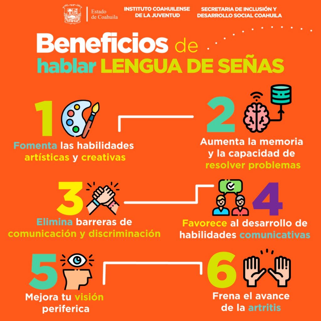 Las ventajas de que las y los jóvenes conozcan el uso del Lenguaje de Señas es el de fomentar las habilidades artísticas y creativas, aumento de la memoria y la capacidad de resolver problemas, elimina las barreras de comunicación y discriminación, favorece el desarrollo de habilidades comunicativas, mejora la visión periférica y frena el avance de artritis.