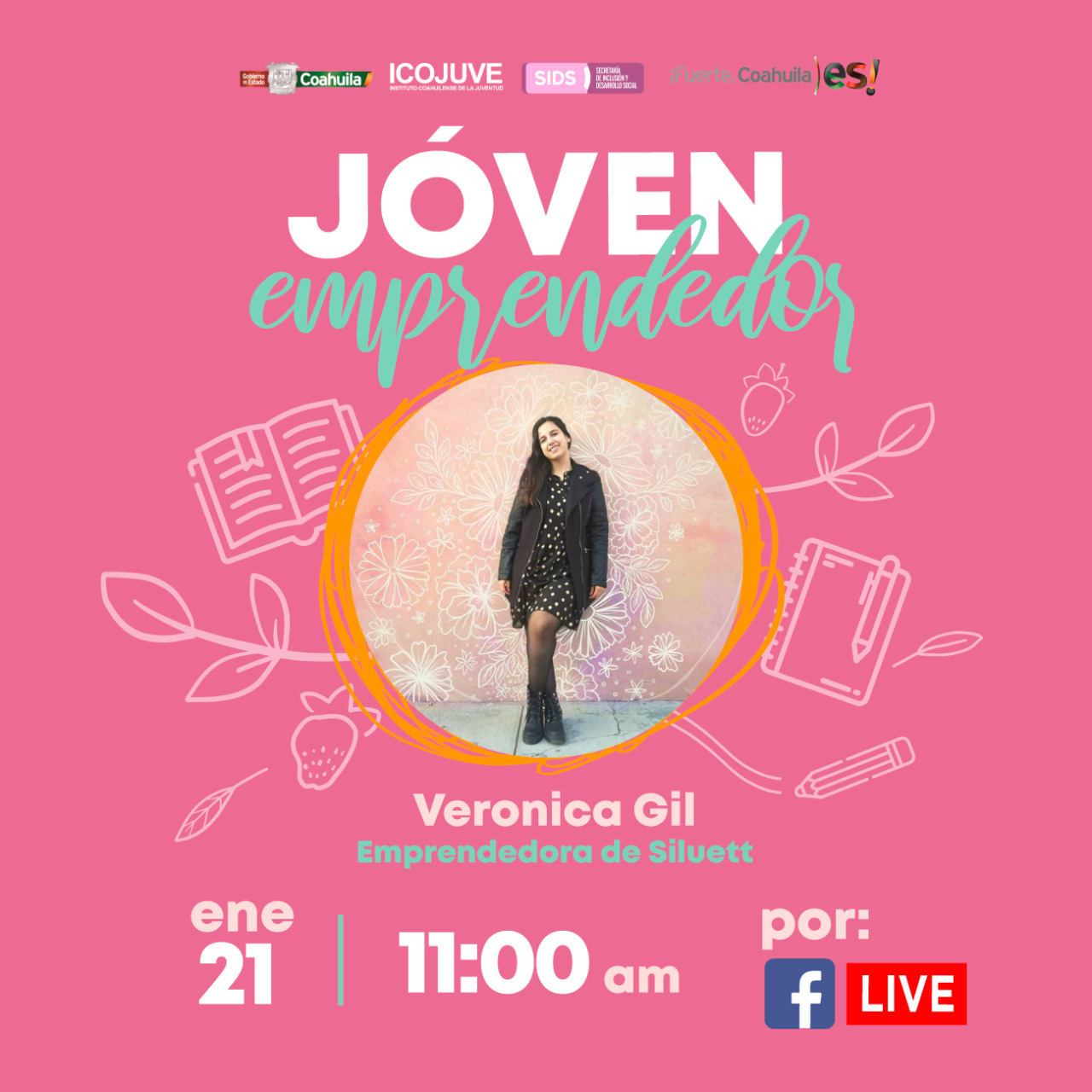 Saltillo, Coahuila de Zaragoza; a 20 de Enero de 2021.- Con el objetivo de seguir alentando el emprendedurismo entre las juventudes coahuilenses, el Instituto Coahuilense de la Juventud (ICOJUVE) invita a participar en la conferencia virtual de la joven empresaria Verónica Gil, fundadora de SILUETT, empresa de papelería personalizada en Saltillo, a 5 años de su puesta en marcha.