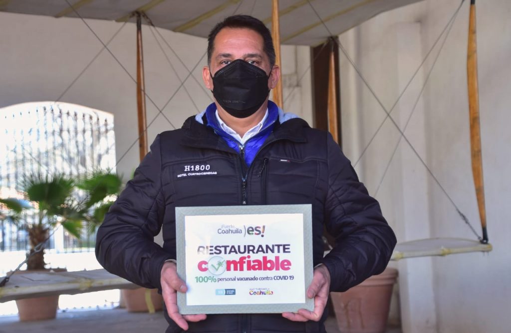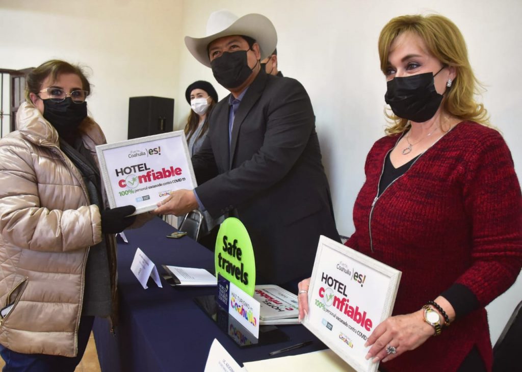 Cuatro Ciénegas, Coahuila de Zaragoza; a 8 de Febrero de 2022.- Cuatro Ciénegas es un destino confiable y seguro, señaló la Secretaría de Turismo y Desarrollo de Pueblos Mágicos de Coahuila al entregar sellos Safe Travels y distintivos por personal vacunado al 100 por ciento contra el Covid-19 a hoteles y restaurantes.