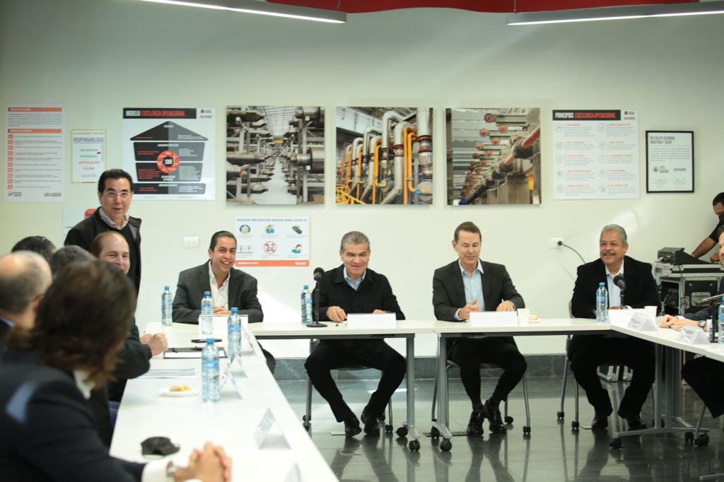 Junto al alcalde José María Morales Padilla y el Secretario de Economía del Estado, Claudio Bres Garza, así como del presidente del Consejo de Administración del Grupo De Acero, Raúl Gutiérrez Muguerza, y el líder estatal de la CTM, diputado federal Tereso Medina Ramírez, el Gobernador resaltó la confianza de inversionistas ya instalados o por asentarse en Coahuila para seleccionar a nuestra entidad como destino de sus proyectos.