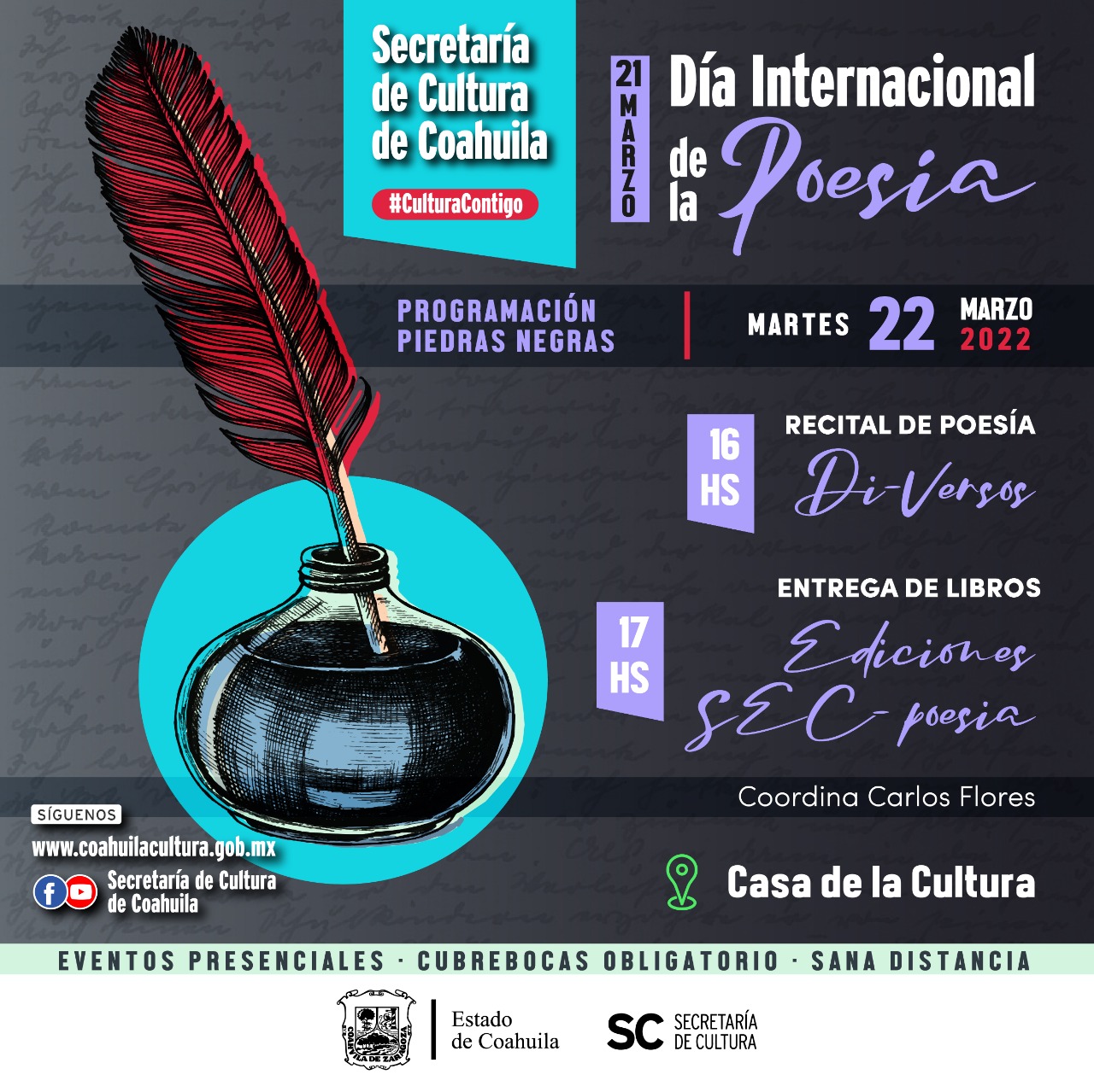 En la Región Carbonífera se celebrará este 21 de marzo, con el “Recital de poesía. Di-Versos” y la entrega de libros, ediciones SEC- poesía, en las plazas públicas de los municipios de Juárez, Múzquiz, Progreso, Sabinas y San Juan de Sabinas.